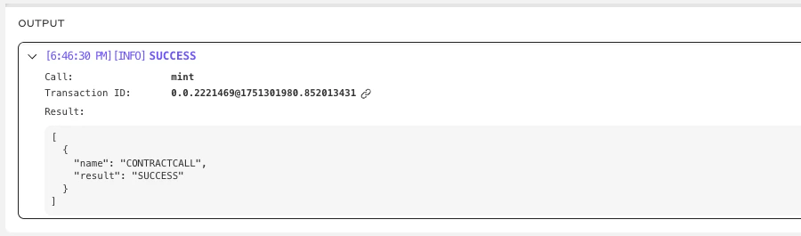 Expanding the output area allows you to check the status of your function call. If you see a status message “SUCCESS,” you’ve successfully minted an ERC-20 token on Hedera.